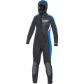 De romp is uitgevoerd in 7 mm neopreen voor optimale isolatie, terwijl armen en benen bestaan uit 6 mm neopreen voor extra bewegingsvrijheid. De aangehechte 7 mm capuchon met 5 mm skin‑in gelaatsafdichting beperkt warmteverlies via het hoofd en sluit comfortabel aan rond het gezicht.